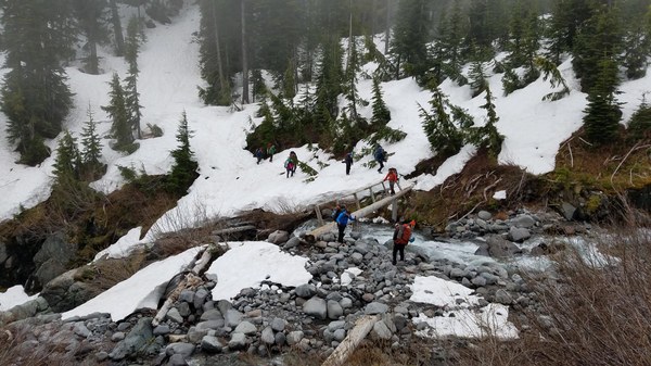 Trail is 80% snow covered but melting fast. Lots of hazards from snow bridges melting out. Several close calls on the way down with people breaking through the snow. Upper mountain still lots of snow which made for lots of glissading from camp down to Summer Land.