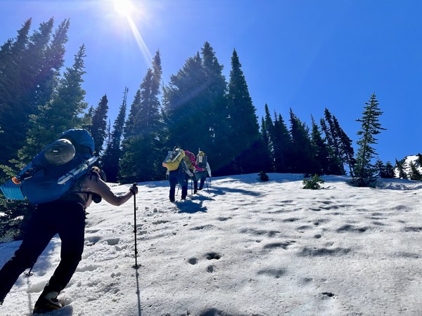 Then we made our way up the steep snow-covered slopes to Meany Crest. Taking turns rotating the leader while kick-stepping for the rest of the group.