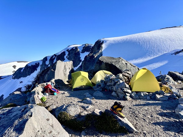 Then made it to Meany Crest camp in 6 hours 25 min (elapsed time) from the trailhead. The camp area is melted out. We fit three tents in the rocks on the left side.