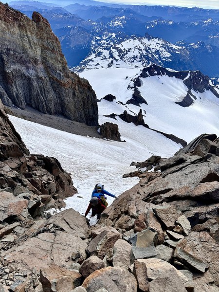 The downclimbing was long (~1,600 feet) and were committed to safely getting to the bottom. Eventually things eased up in a few sections for some traversing but then a few more times switching back to downclimbing. We made it back to the bottom and roped back up. Then headed back to the Whitman Crest notch where we had a water & snack break. Eventually we headed off for the final two miles back to camp. We reached camp just before 6:30pm, making the full day a 16 hr 45 min trip. The day took longer than planned (probably 3-4 hours more) but the conditions contributed to more time needed (in both directions).