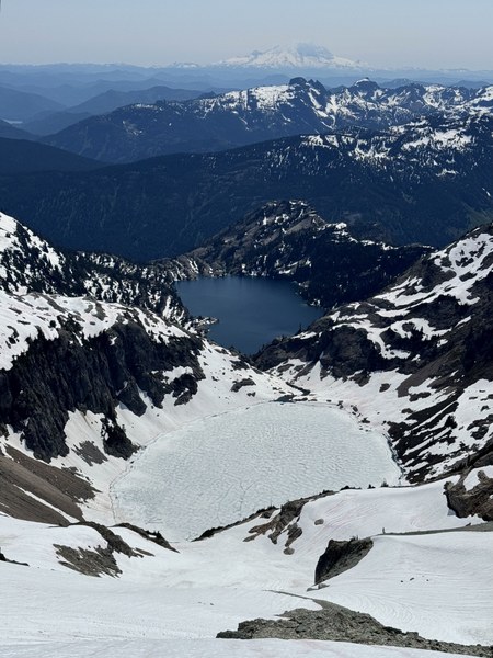 - On the way to Pea Soup Lake we dropped down to around 6200' to avoid going above the buttress with the steep descent mentioned David Johnson's trip report https://www.mountaineers.org/activities/trip-reports/basic-glacier-climb-mount-daniel-lynch-glacier-1. This option was straight-forward. We aimed for a notch that provided a good point to descend to Pea Soup Lake (see photo below).