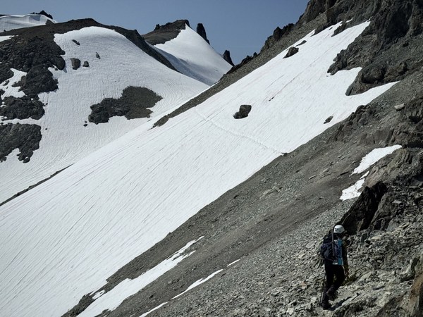 - We took the scramble route down. There was a bootpack set on the traverse below the Daniel's East Peak, which made travel relatively easy and straightforward. However, in a few weeks this will likely be a moderate-angled talus slope.