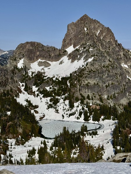 Lots of small creek crossings after the lake; expect to get your shoes/boots wet. Snow started continuously about a mile after the lake. The scrambling under Cathedral Rock was snow-free, which was very fortunate; I wouldn't have wanted to be up there with snow given the likely steepness of a snow traverse and the bad runout. We exited the scramble nearly at Peggy's Pond, which was mostly frozen over. There was a small creek to fill up water about a quarter mile past Peggy's Pond that you would otherwise cross on the route. We camped on snow; there were a few spots on dirt already taken by other parties.