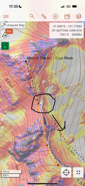 - We dropped down to snow at the intersection of the trail (as seen on the Caltopo map) with the Daniel East Peak. We initially attempted to continue traversing the ridgeline, but dropping down would have required a moderate snow and/or rock descent, whereas this path was gentle.