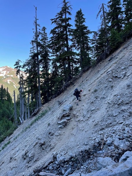 We left camp at 5:30 AM to try and beat the heat. This stretch of trail was uphill but had beautiful views, breezes, and was mostly shaded. A half mile before the Glacier Meadows campsite, there is a ladder going down a washout. The rope beside it is coreshot. Before the very bottom of the ladder, take the purple rope down to the right.