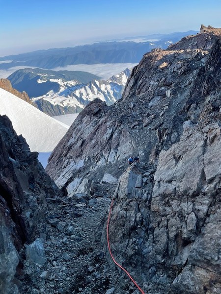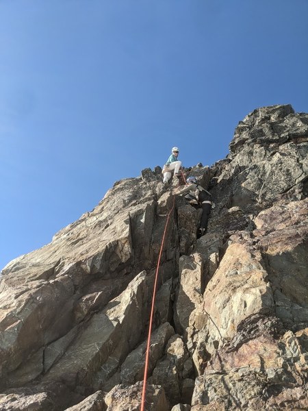 At this point, there wasn’t much of a moat and it was very easy to move from the glacier to the rock. The 5.4 north face rock climb had some loose rock. I tied into the middle mark of our 40 m glacier rope and Craig and Ali tied into both ends. The intermediate anchor is awkward and a bit precarious as it is just a boulder. I’d recommend skipping it if you have enough rope. I placed a #2, #1, and #.5 cam, but there were places for a variety of sizes. I recommend placing gear even though the climb is easy, as the rock quality is a bit sketchy. Here I am belaying Ali from the intermediate anchor, only about 10 meters up: