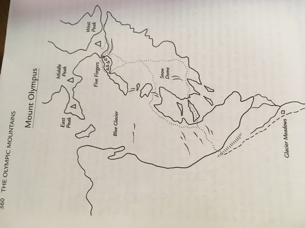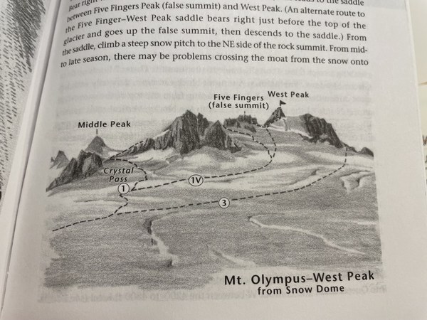 This is where we had a bit of trouble. There was not much of a boot path and we were the only team on the glacier. We missed the notch to the right of the false summit that would take us down an unexpectedly steep slope and then up to the true summit. We did a lot of walking back and forth checking out impassible paths. Below are some diagrams that would have been helpful (the first is from Jeff Smoot's Climbing Washington's Mountains, the second is from Olympic Mountains: A Climbing Guide by Olympic Mountain Rescue).