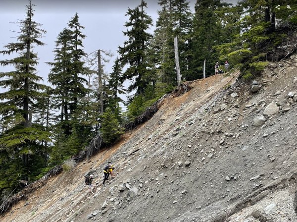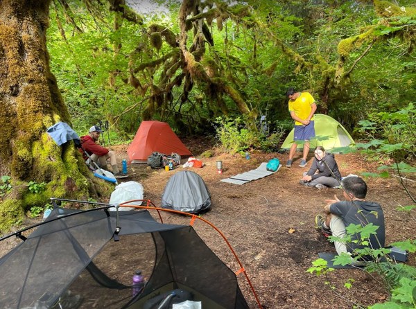 Day 2: We left the camp around 8am. The first couple miles are still flat, but the landscape slowly changes from rainforest into fir forest. After crossing Hoh River, we started gaining elevation as well. With 40lb packs, it wasn't the most pleasant ascents I have done, but knowing it is no more than Mt Si helps :) We got to the landslide and the ladder around 12, put on our helmets and descended. The rangers replaced the ladder and the rope last year, so it was in the perfect shape. Most of us used the rope as a handline instead of ladder to descend. It is dynamic rope, so it creates a bit of a bounce, especially at the bottom.