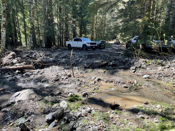 There is also an area of blowdown tree “hang fire” leaning over the FS road which we mitigated by driving under it very quickly.