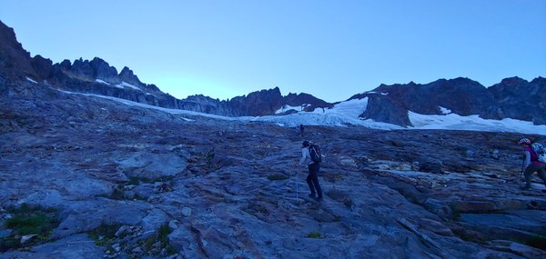 Sahale Glacier was super tame. The snow was quite compacted with only a 2-3" layer of slush. We donned our crampons, roped up and descended down to the rocks just above Sahale Glacier camp with no issues. Glacier melt streams were on the surface of the snow/slush. In the rock section, just above camp, there were numerous locations where to easily gather water.
