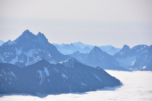 We topped out at the summit at around 7AM to unbelievable views. An inversion layer as far as the eye can see with all the mountains poking through the clouds. Not even a breeze to keep our summit experience short. It was truly a perfect summit.