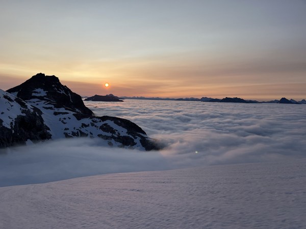 As we progressed further across the Neve, we were greeted with a burning red sunrise over an incredible inversion layer.