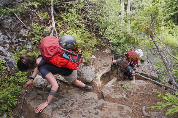 The approach is relentlessly steep and overgrown, with some scramble sections and veggie belay. Not a true bushwhack, though. I've seen way worse. It took us over 7 hours, we took it slow.