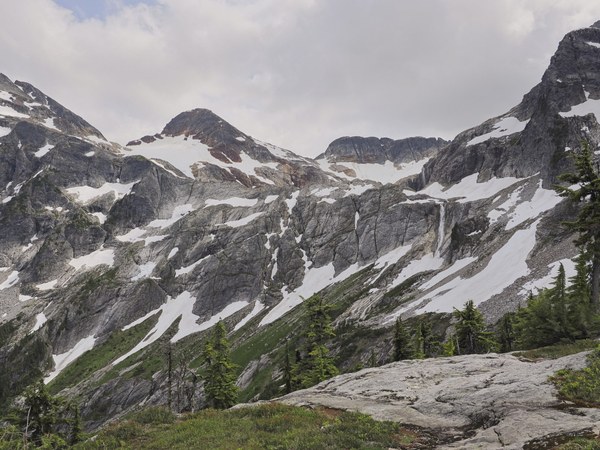 Continuous snow started around 5500 feet, where we switched to boots. The route to the basin is fairly obvious to follow - traverse the boulder field and aim right above the big waterfall. The campsites are on the rocky ridge right in the middle of the frame. The snow patches covering the boulder field will melt out pretty quick making this section potentially difficult before the snow is all gone.
