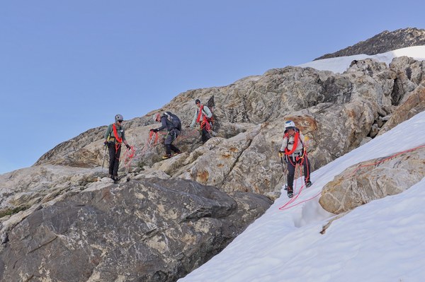 We started from camp at 5:30 am the next day. The route goes along the rocky ridge from camp, and then you descend down onto the glacier. We traversed the slope a bit higher than the group in this picture just to allow for a longer runway in case someone were to fall.