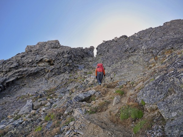 The easier option is to go straight through the notch, down climb a bit and then ascend a scree gully. We opted to traverse left from the notch, and this is way nicer section to scramble. It is quite exposed though, but never very difficult. I highly recommend this option! The views are spectacular!