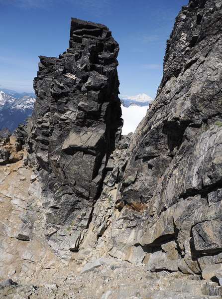 We dropped some gear at the base of the summit pyramid, and started hiking up to the scramble. It is an easy (but steep) hike up to an obvious notch (below), and this is where you need to decide which way to go.