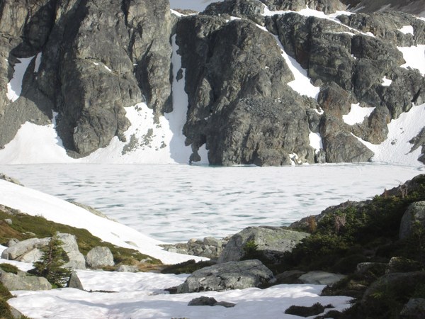 Wedgemount Lake was still mostly frozen. Water available in collection ponds near the tent platforms where we camped.