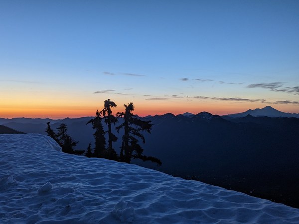 Day 2: Got moving just after 3:15 AM. Traverse between Lone Tree Pass and High Pass was straightforward in the dark, just keep the rocks to the northeast in sight and stay high. It was a really warm start to the day, but snow conditions allowed for pretty good purchase with crampons both in trees and on exposed areas of the crossing.