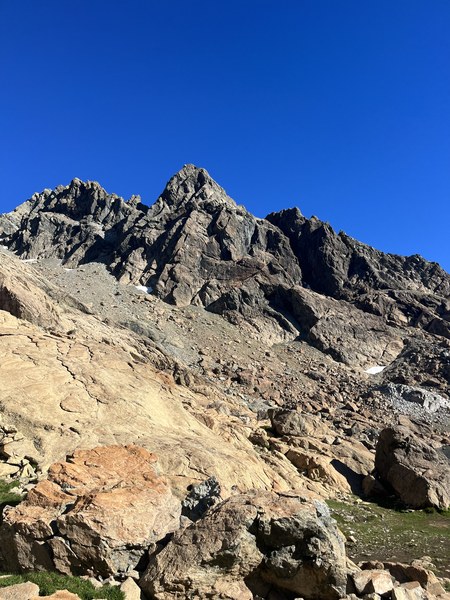 Our team of six met at the Esmeralda Trailhead at 5:30 AM on Saturday July 15. Everyone had arrived Friday night and camped on the forest road leading to the trailhead. After a quick chat and handing out our three ropes (two 60m and a 70m), we steadily hiked towards Lake Ingalls. The hike up was pretty uneventful taking around 2 hours 20 minutes to reach the lake. We took a quick break to grab some food and water at the lake and then headed up to the notch on the south ridge to start the climb.