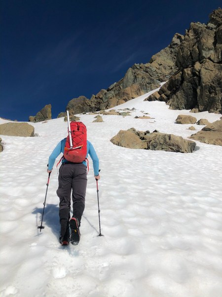 Snow conditions were great - just firm enough to confidently kick steps. Those who packed both trekking poles and ice axes stuck with the trekking poles for the entire trip. The snow currently goes all the way to the base of the Dogtooth with an easy transition from snow to rock.