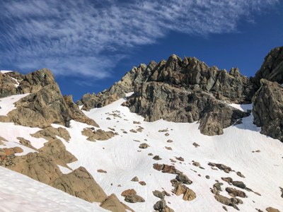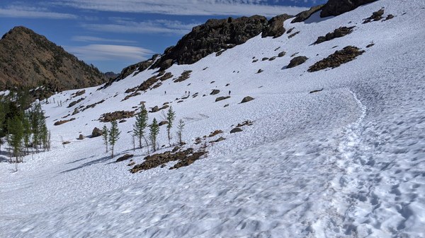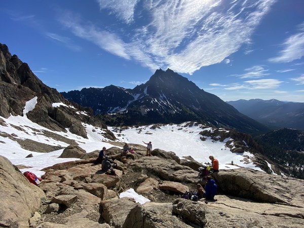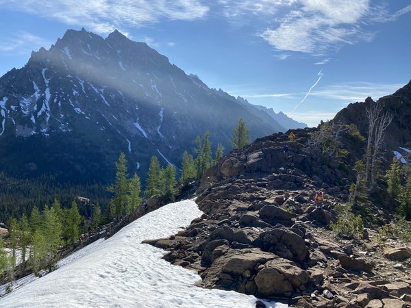 The Ingalls Way Trail from the Esmerelda TH to Ingalls Pass was snow-free with the exception of 2-3 tiny, easy-to-cross patches. The Headlight Basin area still had plenty of snow which allowed our team to circle the basin and keep us from losing/re-gaining too much elevation. The snow also worked in our favor by being firm enough to kick steps on the approach and soft enough to plunge-step in on our descent.
