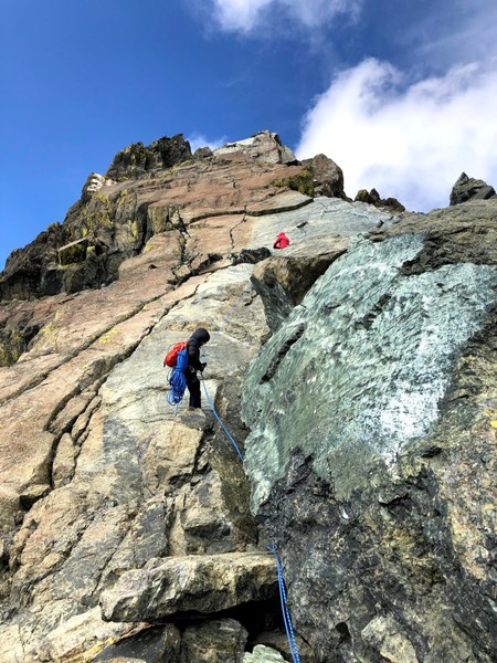 Started climbing about 11:15am. We had 2 teams of two. We split the climb into 4 pitches to allow the second team to get to the belay, a short scamble about 15-20 feet above the moat, which was otherwise not large enough for 4 of us to maintain adequate level social distancing.