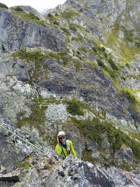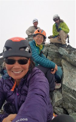 We should have gone further climber's right to climb up to the ridge, but Hong led this harder chimney to the ridge. It was a dirty, short pitch, but not easy. A rock came flying and almost hit Jerry who was belaying. Luckily the anchor above on the ridge was a good one so I asked her to belay each of us up. We also avoided having to protect the exposed ridge to reach the summit by doing it this way.