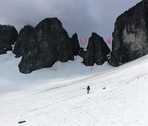 It was 7:30pm by the time we were all down and ready to go. We made the mistake of trying to reach the Cache Glacier directly from the "V" notch. We spent too much time descending it and then finding the moat too deep to cross so had to climb back up to the notch around the back and back to the "U" notch. From there we used another sketchy anchor (which had that rope that was left behind.)
