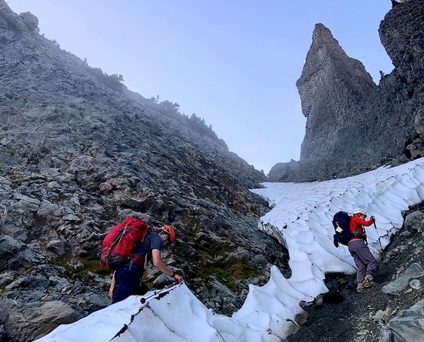 Crampons and ice axes are unnecessary at this point in the season; the remaining snow in Needle Pass can be avoided by staying on the left or right side of it.