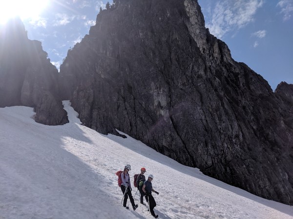 Opted for the summer route as weather was warm recently with some rain. Route is in a very good condition. Pretty much snow free until the Snow Lake fork. Afterwards some post hole danger in the Source lake band and a few thin snow bridges. At upper elevation snow cover is still quite good. The moat in Pineapple pass exists but we were able to cross onto the rock and scoot above or besides the moat, this move is a bit more tricky on the way back if you choose not to rappel from the base. The walk around the pass to the base of the climb was in a good condition but sketchy as always. The climb itself was completely dry with no major events. On the way back we opted to do the walk around again, but a rappel from the base (2x 60m) is possible as the snow is still quite high. Walkout was again uneventful except a few postholes in lower elevation next to Source lake.
