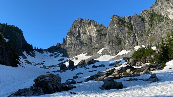The trail is snow free to the end. There is still a snowfield above Source Lake which we used microspikes and ice axes to cross. The Great Scott Basin is still mainly snow-covered. We stayed clear of edges near boulders. There is running water in quite a few places in the lower part of the Basin. We had no problem scrambling around the Dog Tooth on rock up from Pineapple Pass. There is a new bolted rap station at the base of the climb and the tat is gone. (We actually met the guide who had installed them--he had just arrived with a client when we were finishing.) We used the bolts as our belay anchor for the first pitch. Thank you to Nick Mayo of Everett for sharing a trip report from his Monday climb with me.