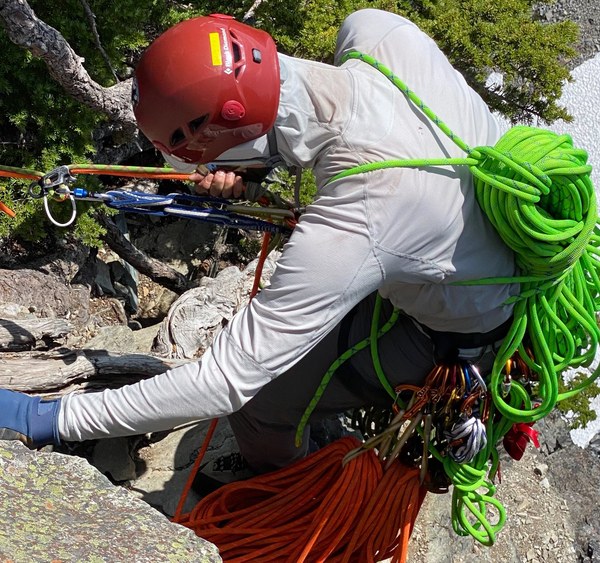 Andrew backpacked one rope down. I went down last, stopped at the base of P4, pulled the first rope and untied the knot. Magda and Andrew then pulled that rope and set up the second double rope rappel to the base. I pulled the final rope, backpacked it, and then scrambled down to the next rap station just below the top of P2. I was the last one down again, and I pulled the knot over the edge to make it easier to pull the ropes. I arrived just at the base as a guide and his client were arriving--the only other people we met on the climbing route that day. Magda, Andrew, and I were easily able to pull the double rope. It worked well, and I'd do this again with students.
