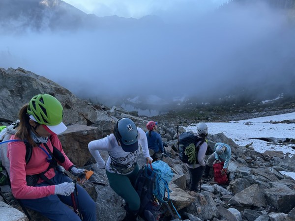 The six of us started out at 5am and had a steady approach. We stopped just past the end of the trail to put on microspikes and helmet and get out ice axes to cross the snowfield above Source Lake. We kept the microspikes on until just below the Dog Tooth, where we stashed them, along with our poles and ice axes, since John had climbed the route the week before, and we knew the scramble to the base would be snow free.