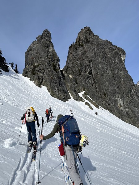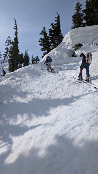 Our party of 6 arrived at 5:30am at the main Alpental parking lot, did a gear/beacon/group check and walked up to the winter source lake approach. The upper lot was closed with lots of construction activity. The approach to source lake was relatively straight forward, though the snow was firm and slick in spots making ski crampons helpful. After a short break we started our kick turns up lower great scott bowl around 7:30.