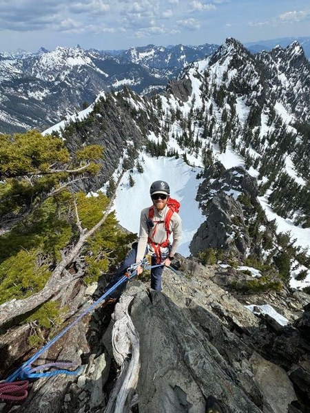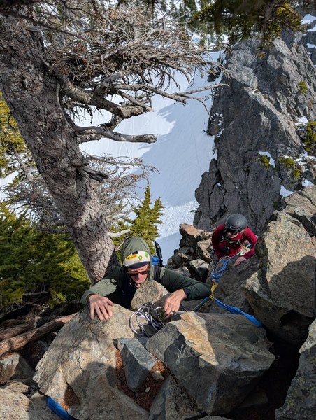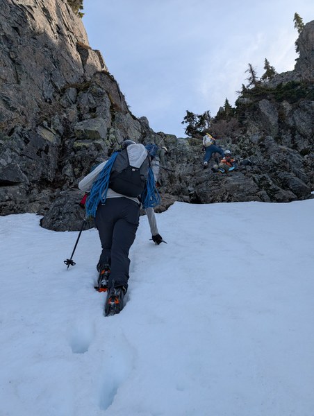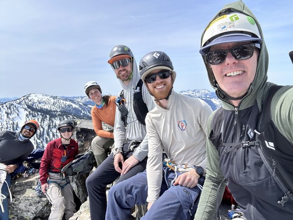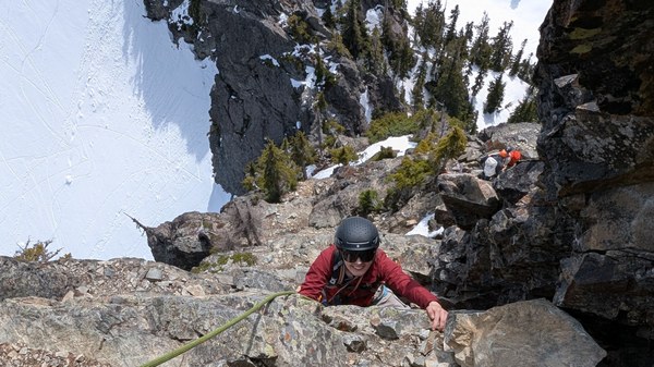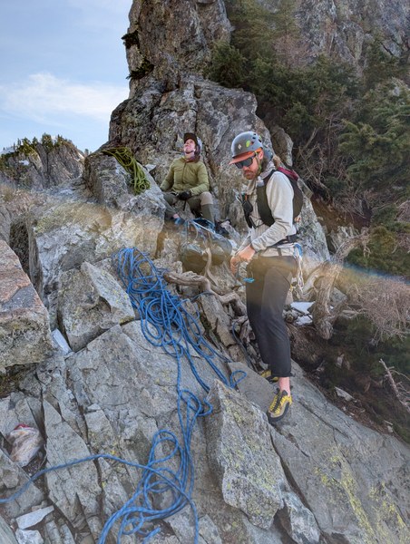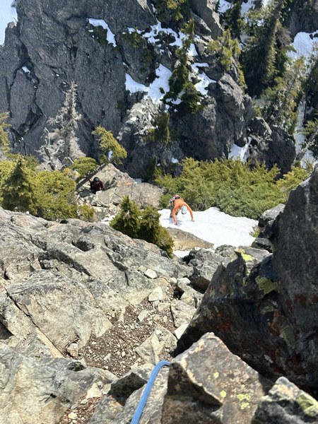 Most folks swapped into their rock shoes, but a couple of us wore mountaineering boots which was nice on the patch of snow on pitch 3, but it was definitely overkill. The sun was warm on the south face, the climbing itself went smooth (minus one stuck nut), the anchors appeared in good condition, and we all topped out just before 1pm.
