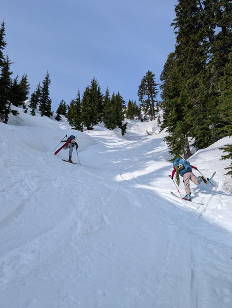 The snow was already quite slushy, but boot supportable and we didn’t see any roller balls or avy activity as we’d been moving. We made it up to the pass, then slowly plunge stepped down the back side and booted back up to the base of the climb in about 30 minutes with relative ease.