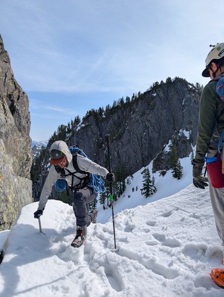 Continuous snow on the approach with no creek crossings yet, though holes were opening and the snow down low was very dirty. Deep, slushy, yet supportable snow booting to the base of the climb. The warm sunny weather dried out the rock fully despite 6” of snow on Sunday. There’s still ~3 feet of snow to boot across on the flat section of pitch 3, but it was not a major concern. Small wet loose slides on our exit, but nothing natural slide and no noticeable overhead snow exposure in the basin/on route.