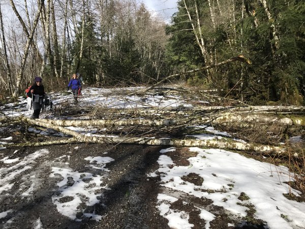 Road was impassable short of 2.5 miles due to tree fall. We cut one tree with a bow saw I brought but the next one was just too big so we quit and started hiking the rest of the way. Put snow shoes on 1/2 mile from trailhead. Passed a couple of people that turned around that were planning on doing Baring as a climb, they said the conditions were way too wild. Another person without snowshoes also turned around. We went almost to the lake but the trail was difficult to find and there were a lot of tree obstacles that made the trip almost impossible. We went the furthest than anyone else and even though we did not make our destination we went a lot further with a lot harder trip (this was NOT an easy snowshoe by any means). I consider this successful not because we made our destination but because we got a long way and had a lot of fun as well as got out and played in the snow. On the way back someone had cut all the trees up to the tree fall short of 1.5 miles. See picture, this one would have taken a ton of time too clear. I plan on going up to this area in the late spring to see what the trail actually looks like, just for fun.