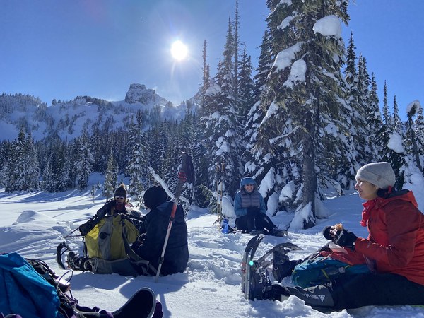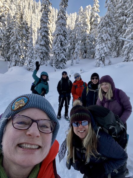 We enjoyed many views of Mt. Tahoma along the way and some sun sneaking through the trees. A group of overnight campers were climbing their way out and mentioned it was a VERY chilly night! They were glad to get warm with their physically efforts. Our group made our way down to the Reflection Lakes area and everyone was ready for lunch and a break. We tried to find a spot with a view of Mt. Tahoma/Rainier, but the sun is still low this time of year and wind gusts were a deterrent. So, we took some time for photos and then found a nice spot out of the wind and great views of the frozen lake and Tatoosh Range. Folks had fun visiting and talking about their go-to winter outing lunch necessities and/or ways to keep things somewhat hot!