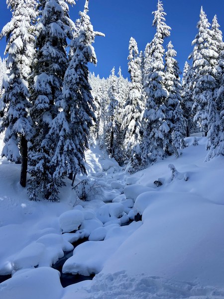 New snow had fallen earlier in the week and we weren't sure how the trail conditions were going to be as the gate is closed during the week for this winter season. We had a few other groups that started before us so we had a trail broken until the junction on Stevens Canyon Road. Everyone was traveling the road on this day and our plan was to take the forest trail as this is a Basic Snowshoe trip. We felt it was better to travel amongst the trees for a potential windbreak and that did pay off. The snow was sooooooooo fluffy that breaking trail was actually fun!