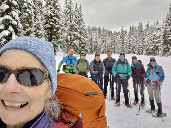 Starting from the Silver Fir Lodge (note: plan to get there earlier than 8:45 on weekends and Monday holidays), we headed up generally following the blue diamond marked Nordic Pass Trail as far as our first lake: Hyak. From there, we headed up to Grand Junction, then worked our way under the power lines, and tagged our second lake: Rockdale, and called it first lunch. From Rockdale, we attempted to make our way directly through the forest, but the former clear cut in places had so many smaller tighter trees that travel was difficult. So we worked our way back to parallel along a cross country ski trail. Heading up towards Surveyors Lake, we started to follow the power line service road, but took the opportunity to head off through a (luckily) more mature forest where the trees were nicely spaced. We quickly arrived at Surveyors Lake, and used our probes to measure a snow depth there about 170cm.