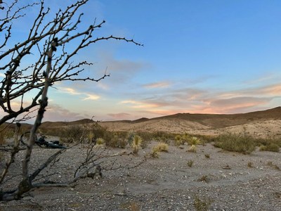 Left Las Cruces around 8:15 AM and rode through downtown and the farmer’s market and therough irrigation canals to exit town and join the beautiful singletrack trails of the Dona Ana system. These were stunningly beautiful and not very technical but took some energy and time our of our day. A powerline road took us back to the Rio Grande Trail (an irrigation canal dirt road) and through Radium Springs. Here we had a pit stop at Blue Moom Grill, an awesome self-proclaimed “modern dive bar” which was actually a pretty nice restaurant and bar with live music. Music would start later but we refilled all our water bottles (all of us were carrying 5.5 + liters each) and bought a take-out dinner to carry to our designated dispersed site in the mountains, some 9 miles away. The next 9 miles took us 3.5 hours due to steep loose gravel climbs and descents and a lot of required hike-a bike under very hot temps. We arrived at camp right before sunset after a 10 hour day and enjoyed a well-deserved take-out dinner and a quiet rest time as the sky changed into all sorts of pink and purple hues.
