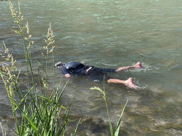 and when back on the double track trail we rode a quick 3 miles to a flat terrace by the river with two lonesome trees that worked as a good campsite for the 3 of us. There was a limited amount or rock-free surface on which to pitch tents so this would not be a good site for a big group. Easy access to water but not really a beach. We took a refreshing dip in the river. We had a pleasant evening there and nice morning at camp before retracing our way back to the trailhead the next day.