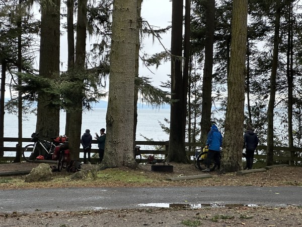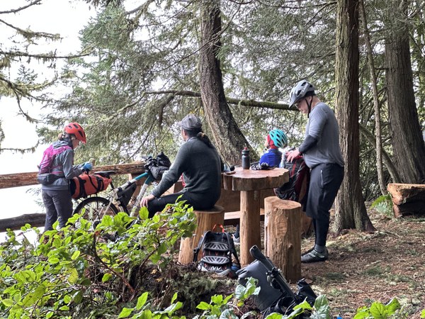 We began pedaling at 9:00 to ride the singletrack of the Bunker Ridge Trail. We soon discovered that riding the climb segment of the trail was ambitious as it gained 900 feet in just over a mile. We settled into our hike-a-bike rhythm, pausing along the way to discuss techniques and ways of efficiently moving over more rugged terrain with fully loaded bikes. Near the summit, we were treated to Becca’s Lounge, a cafe-like setup overlooking the strait with a bench, table, and chairs created by the WTA.