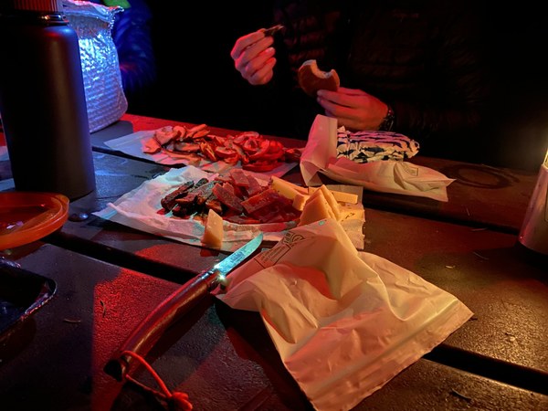 We gathered round the picnic table for our dinners and discussed our day’s events. We shared strips of billtong, dried ham, slices of Parmigiano Reggiano and rosemary olive oil Asiago cheeses, dried apples, and pears.