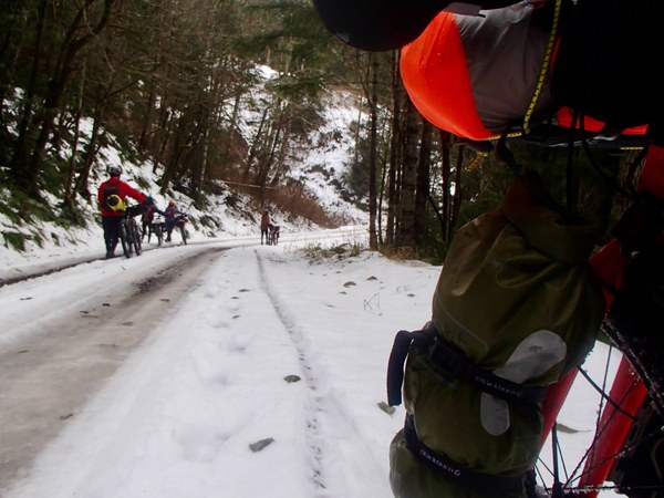 With six more miles of snow-covered singletrack ahead of us, and a desire to reach our campsite before dark, we opted to shorten our route by four miles by riding the Joyce Access Road to SR-112. The road was initially clear, and the gravel was fast. We would however soon encounter a series of road segments covered in sheets of compacted ice, turning our easy descent into a spicy mix of gravel and icy hike-a-biking.