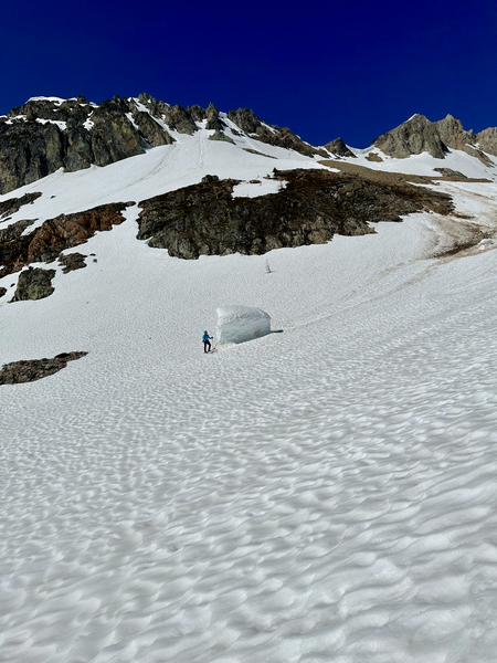 To further reinforce the recent warmth, we saw widespread evidence of a variety of avalanche activity, including a slab avalanche that produced a significant crown and propagated widely on a layer close to the ground, a powerful wet-loose slide that dumped a huge pile of trees in Ann Lake, and hunks of fallen cornices the size of a van.