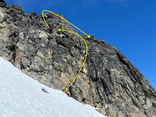 Once just below the summit block, it took some exploring and pondering to find a way to get on top, but we located a usable path via a seam in the rock at the top of a snow ramp. Two of the party members gave it a (successful) go in their ski boots, while two other party members elected to save it for another day with different footwear.