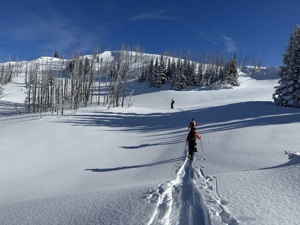 The ridge that runs W above the col holds a large number of N-facing lines that held deep, cold snow that made for excellent skiing, and we took multiple laps there, with enough space and snow to share with some other parties in the area.
